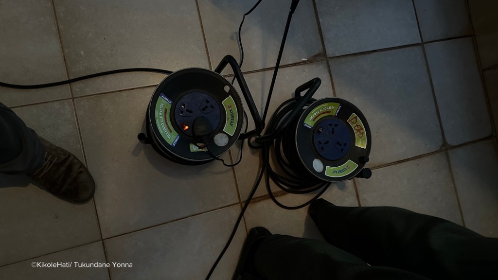 A colleague from ICT came and tried the same steps, but the light still didn’t work. He then went back down the stairs and returned with a second extension cord. When we plugged it in, the light finally came on. We had power, but we didn’t want to celebrate just yet. My supervisor and the team were still chatting with Mr. Grandi while we worked on the light. Once it was fixed and the camera was rolling, everything was ready.